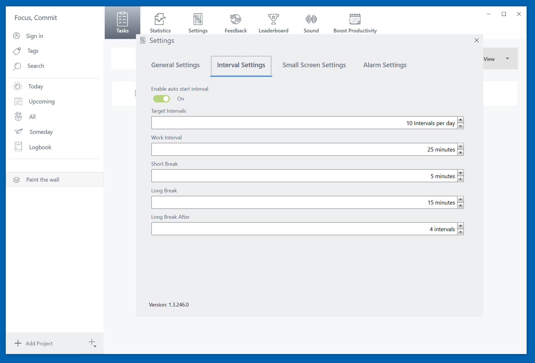 In Pomodoro Technique, by default, the interval is 25 minutes. However, if you feel it’s too long or too short for a task, you can change it at Settings.